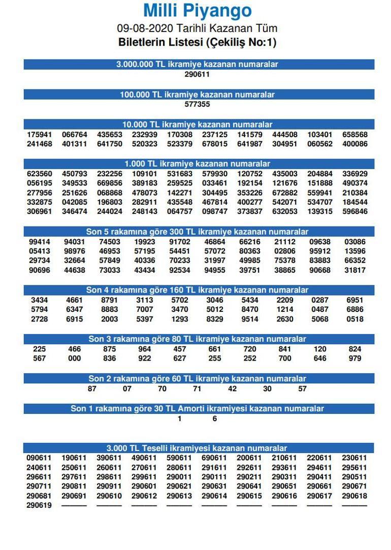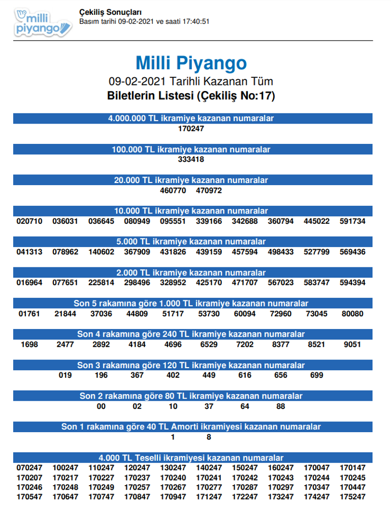 Milli piyango çekiliş sonuçları milli piyango resmi i̇nternet sitesinden alınmıştır.